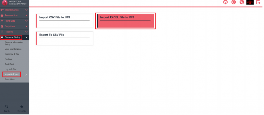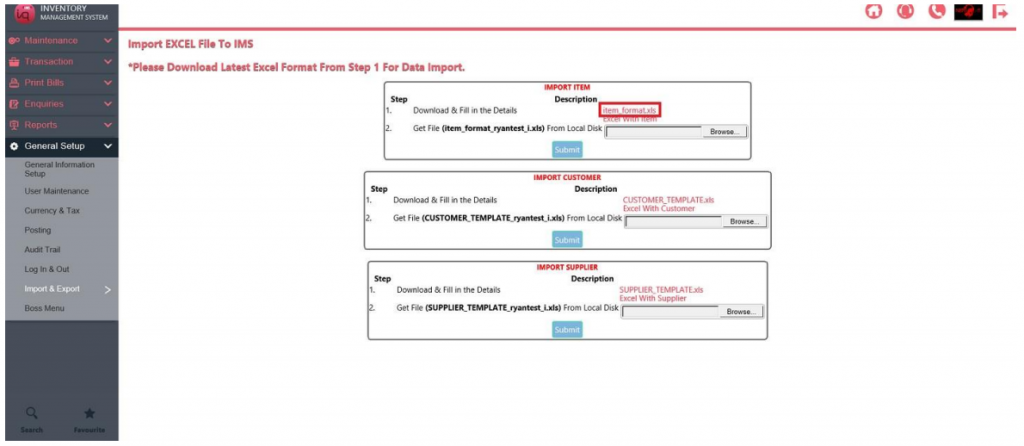 1) At IMS home page, navigate to General Setup – Import & Export – Import EXCEL File to IMS.