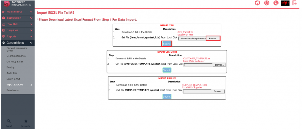4) Now at IMS home page, navigate back to General Setup – Import & Export – Import EXCEL File to IMS. Select browse for the file and click on submit.