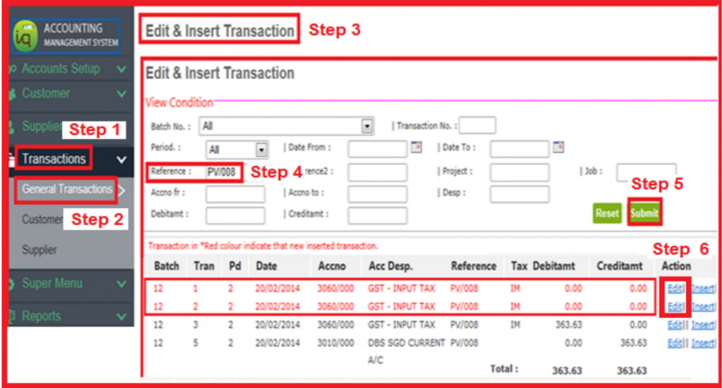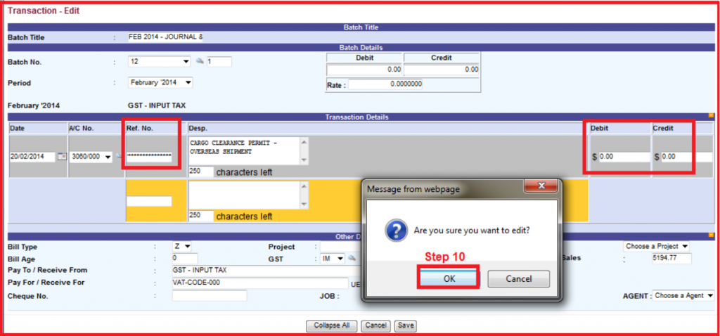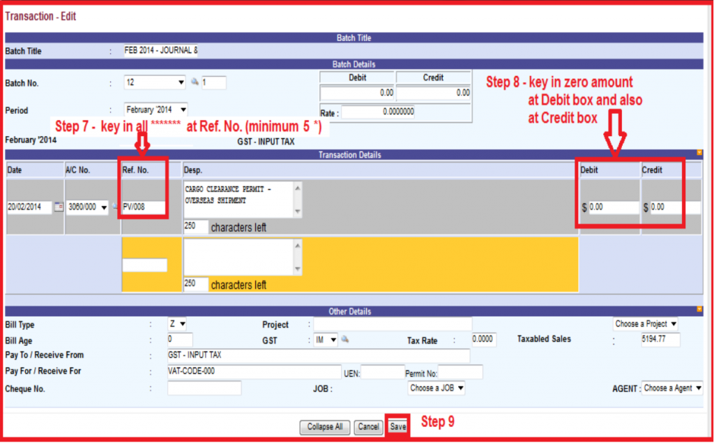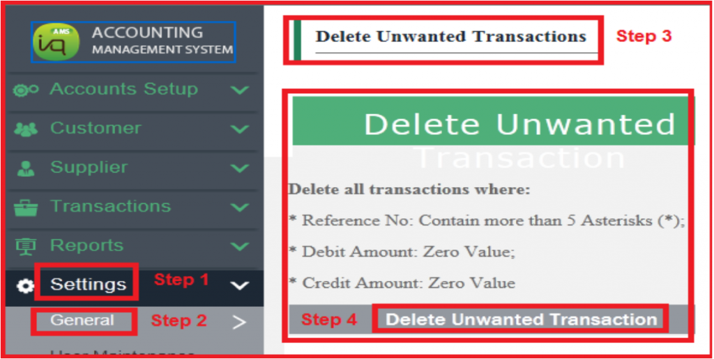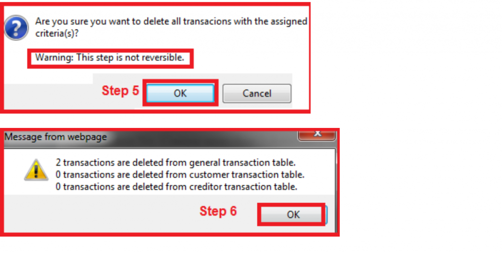 To delete unwanted transaction, user has to replace the ref. no. with more than 5* and also has to edit the debit entry and credit entry with zero amount.