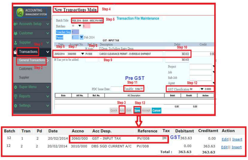 At New Transaction Maintenance, user must key in pre-gst transaction follow immediately by the gst transaction.